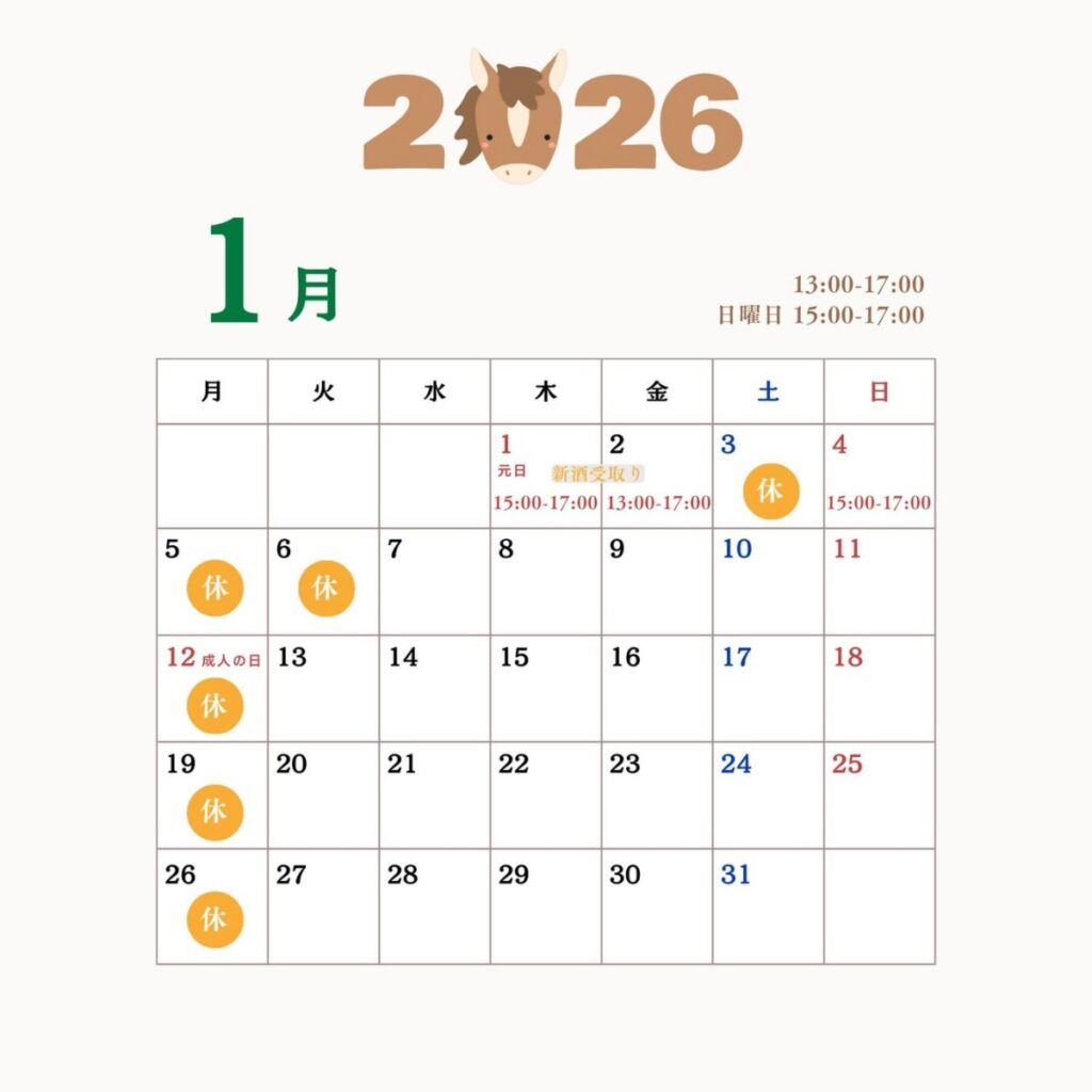 - 1月2日(金)13:00〜17:00(新酒受け取りのみ)